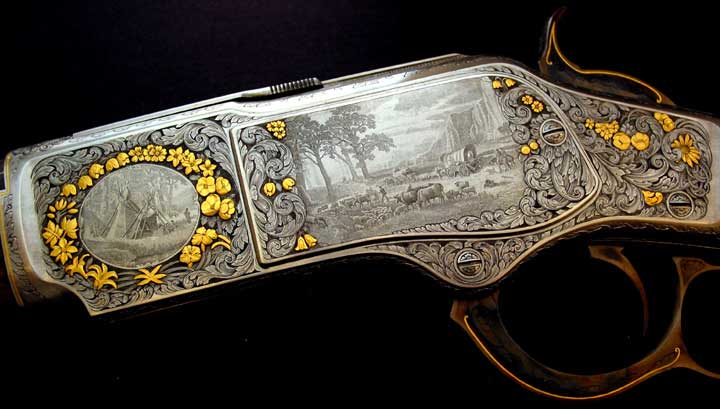 I had the pleasure of viewing this gun at the show. I must say this engraved gun is awe-inspiring. The engraved picture is done in a banknote style of engraving for which Robert Swartley has truly mastered.