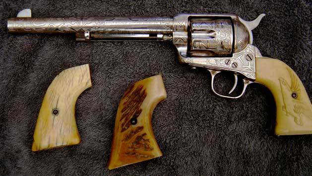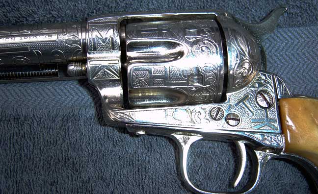 Tim....I believe John and Weldon are right..Your colt was done by Cole Agee...it was manufactured in 1874 according to the serial #...which maybe the key to you finding out who engraved it. A Colt dealer at the gunshow had a Cole Agee engraved Colt in his showcase it was priced at $2,500. As Ron said you might want to get in touch with Bob Evans...Also here is a friend of mine in Conn., an antique gun dealer..very knowledgeable man..Joseph Hajec..860-379-5503..PO Box 661..Winsted, CN 06098..Hope this will be of some help.