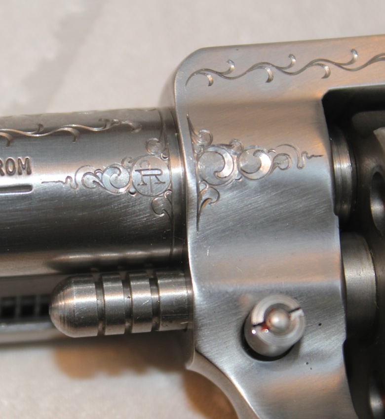 I just purchased these two engraved Ruger Single-Six's. They are engraved with the same engraver's mark. I called Ruger and it's not a factory job. Any help would be appreciated. They both have the same marking on them. You can see it in this picture just forward of the frame, at the beginning of the barrel.