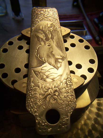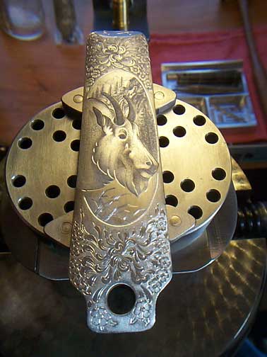 To Andrew my friend: I have primarly three work stations; the first station is where I use a modified foredom recipicating power assisted hand held piece, its very similar in appearance to the neumatic hammers and it is almost identical in size and feel as my hand held ones. I've modified it to run 20 to 4000 impacts per minute and have made other minor modifications. I tried to use a neumatic hammer once but the slight hissing sound that came from the unit (I believe it was a gravermax) bothered my hearing (and yes I do use a hammer and chisel and hand engravers), I used multiple multi faceted bulino picks in engraving the goats head and all the shading on that floor plate. I use all traditional style and techniques.