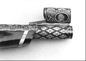 He specializes in knives and pistols with native American designs as well as game animals with American scroll borders.